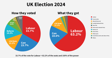 The distorting effects of FPTP in 2024 led to the governing party (Labour) having 63% of votes with just 34% of votes. This was the most disproportionate UK general election result in history.