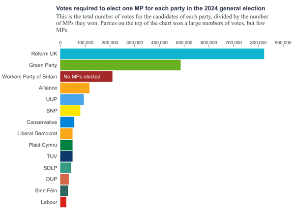 The number of votes required to elect an MP varied dramatically from 23,600 for a Labour MP to 820,000 for a Reform MP. This feeds into peoples’ distrust with politics and feeling that they system isn’t working for them.